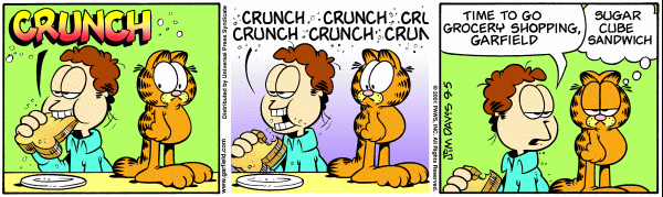 這則其實很簡單好懂。crunch 是咀嚼得嘎吱作響的動作,也可當狀聲詞,表示吃很硬很脆的東西時發出的聲響。在這裡我會解讀為狀聲詞,因為加菲貓不正是因為聽到聲音,所以才轉頭看 John 在做什麼嗎?